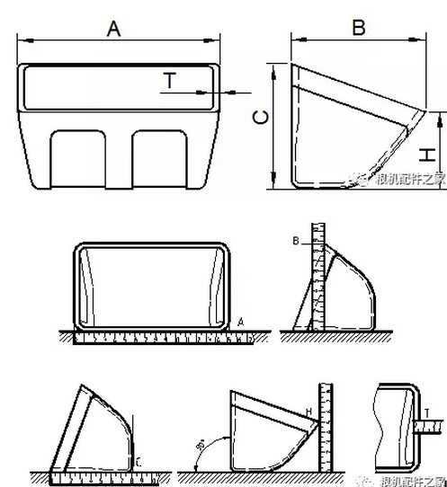 畚斗的測量:針對已有實物的畚斗進行測量,正確測量方法如下圖